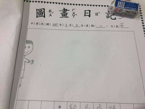 ▼這位媽媽貼出兒子的圖畫日記,只見2月5日這天,兒子只在左側畫了半邊人臉,中間空了一大塊,讓媽媽很困惑。