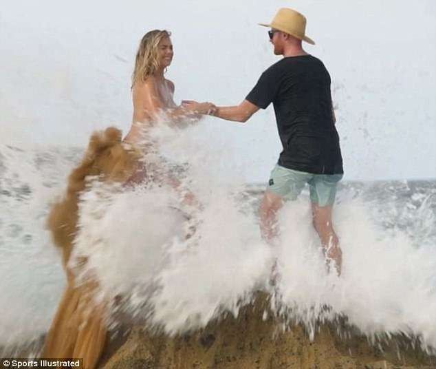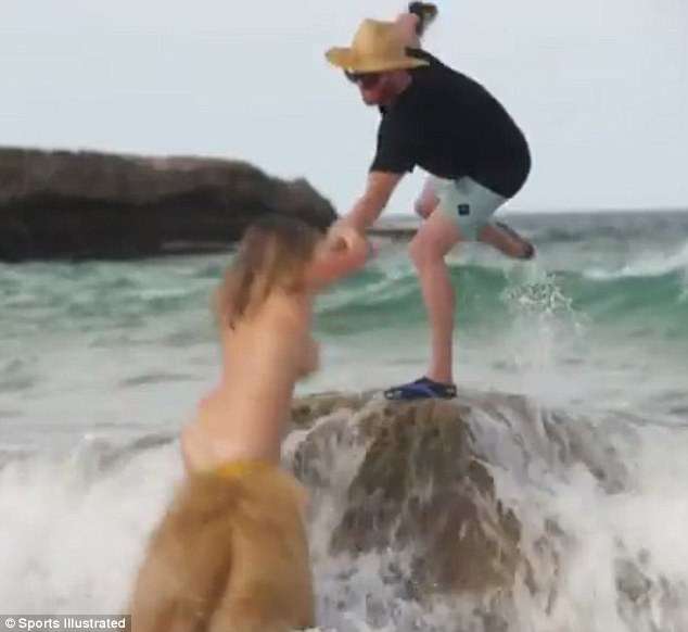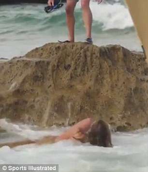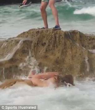▼這超火辣的一幕非常吸引人,但一陣大浪襲來,Kate不慎滑倒,直接跌下石頭,掉進了水裡。