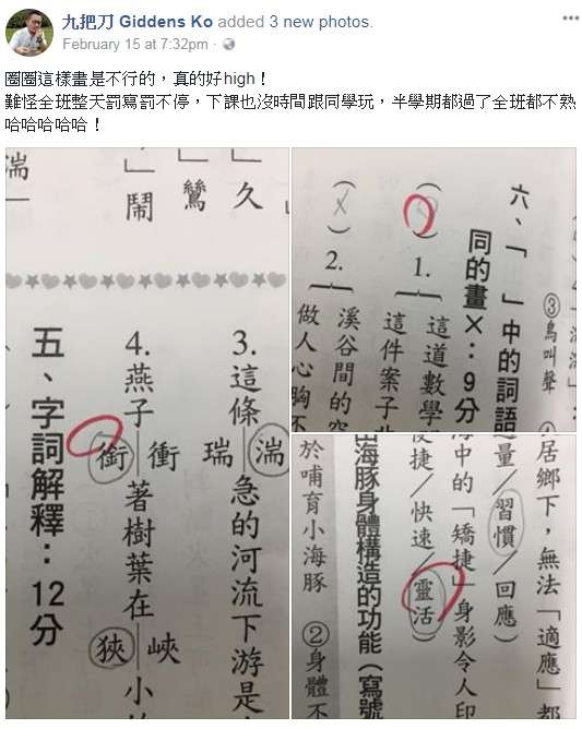 ▼九把刀日前在臉書po出了3張小學試題的照片,無奈表示「圈圈這樣畫是不行的,真的好high!難怪全班整天罰寫罰不停,下課也沒時間跟同學玩,半學期都過了全班都不熟,哈哈哈哈哈!」