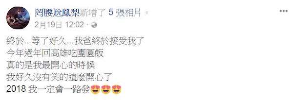 其他網友也在下方恭賀說:「令人感動的一刻,恭禧罔腰老爸終於接受妳了,時代不同了,每個人的觀念都要改變一下,活的開心快樂有意義更重要!」、「讓孩子做自己最重要,這並沒有什麼,要祝福他們,只要他們能開心就是做父母最大心願」、「一開始不是爸爸期望的你,但是你永遠是他的孩子,最終他就是希望你很快樂最後他自己妥協,父母都是這樣的,只要你過的好。」這真是令人感動的一刻啊!