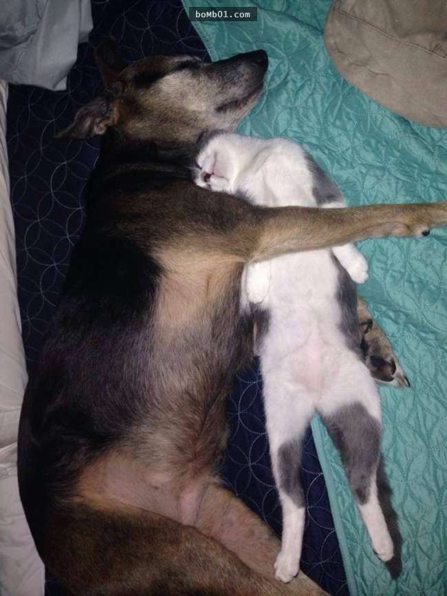 ▼相親相愛的一家人,躺在狗兄弟的溫暖懷抱。