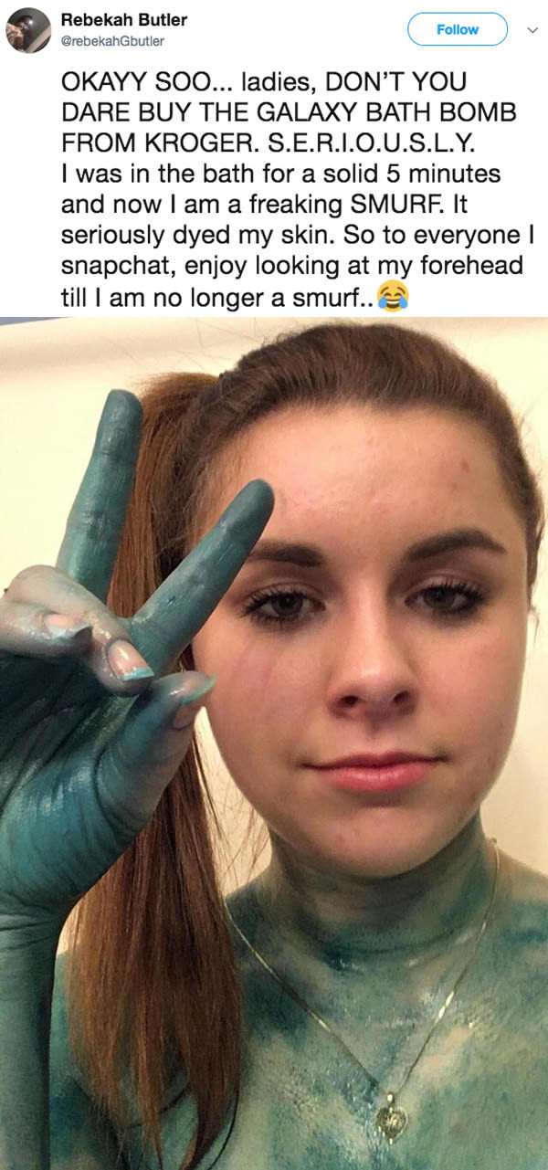 ▼「好吧……女士們,絕對不要從克羅格買銀河系泡澡球,我是認真的。我泡了5分鐘,現在變成藍色小精靈了。我的皮膚被染成了藍色。」