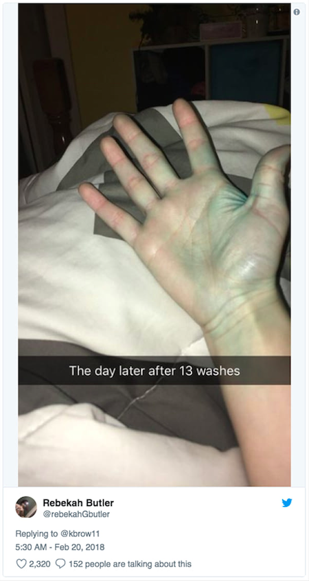 ▼Rebekah拍照表示:「洗了13次終於不那麼藍了。」