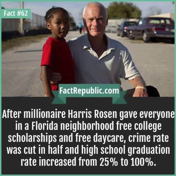 ▼5. 百萬富翁哈里斯羅森給了他佛羅里達鄰居免費日托和大學獎學金,這使當地的犯罪率減少一半,而且高中的畢業率從25%升到了100%。