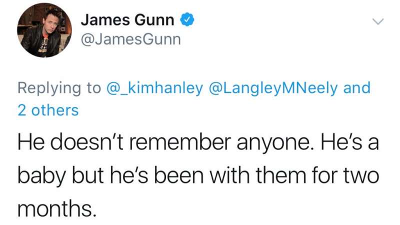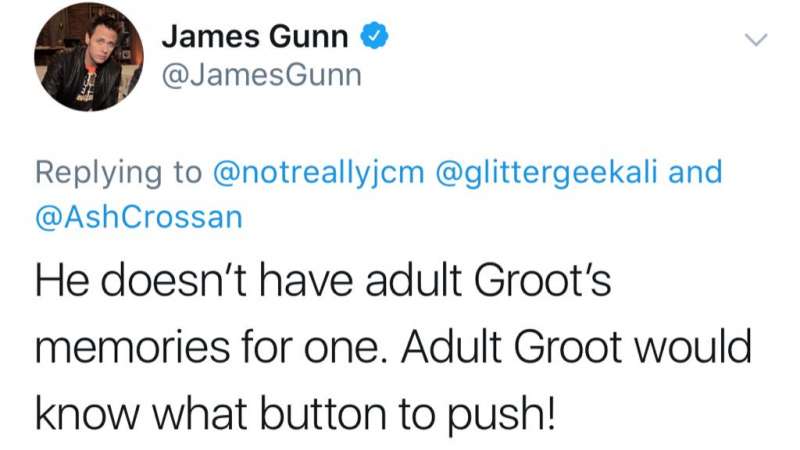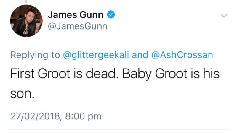 ▼詹姆士在2月27日於推特上回答網友的問題,他親自證實:「第一代格魯特已經死了,小格魯特是牠的兒子。」
