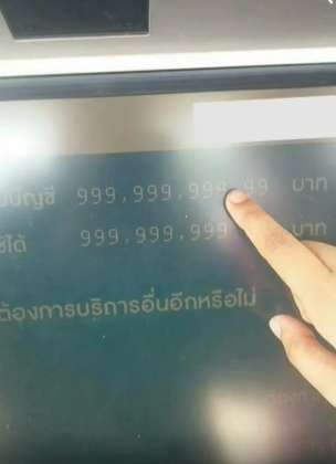 2018年03月04日不久前,泰國佛丕府男學生Wuttichai Meemak到泰京銀行開戶存入9000泰銖(約新台幣8700元)。不久後他使用自動提款機時,發現存款餘額竟然變成了9.9999億泰銖(約新台幣9.68億元)!