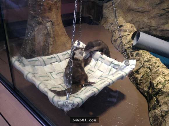 ▼水獺在游累了之後,會躺在吊床上放鬆休息。