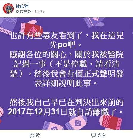 ▼懲戒委員會決定依照法規記過一次,林氏璧隨後也在粉絲團上表示,自己早已在去年底提出離職。