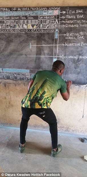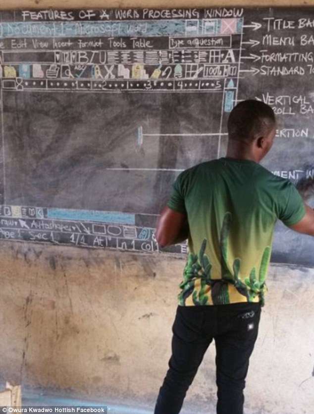 上電腦課,當然要用到電腦。但非洲迦納(Republic of Ghana)的一間學校條件貧瘠,根本沒有電腦可用。老師Owura Kwadwo給孩子們上課時,只能用粉筆在黑板上畫Microsoft Word的界面。