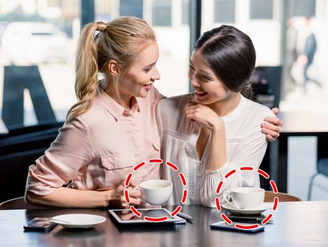 約有70%的重要資訊都是在吃飯時互相分享的,這時候可以仔細觀察對方的動作。如果對方將桌上其他東西如杯子、碗碟擺放得將兩個人隔開來的話,可能代表著不想和對方有著太接近的距離;相反如果兩個很親密的朋友在一起用餐時,會將兩人之間不必要的東西都移到一旁。