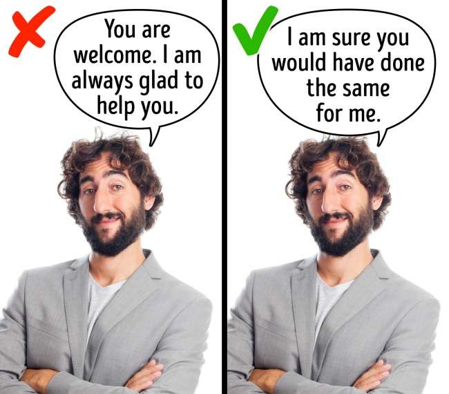 當別人對你表達感謝時,不要說「不客氣」,比較好的回應是「我相信你也會為我做一樣的事」,從而表達出一種互惠的感覺。