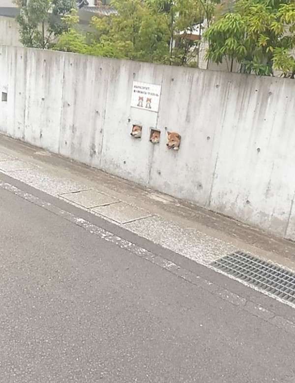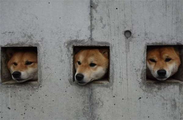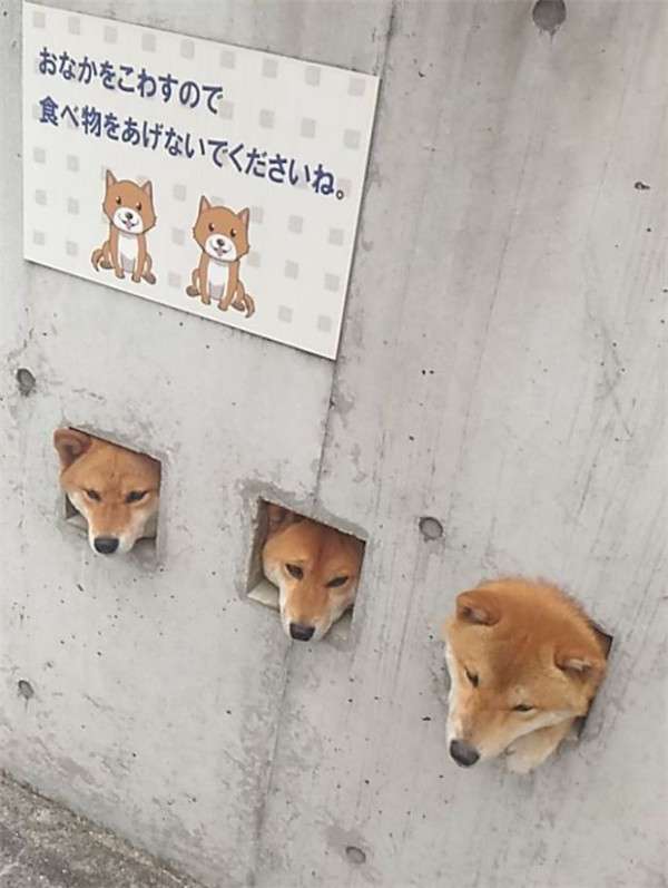 ▼誰知這三隻調皮的柴柴不滿足於透過小孔看外面,而是喜歡把頭伸出來,但是小洞比牠們的頭大不了多少,只能剛剛好卡住,而且三隻喜歡同步做這件事情,所以路人就看到了這個滑稽的場景。