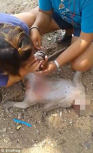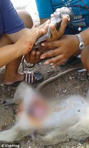 2018年03月07日路上的汽車越來越多,路殺事件也時有發生。不久前,泰國北攬坡府的一隻母猴就遭遇車禍,生命垂危。牠肚子裡還有寶寶,如果得不到救治,就是一屍兩命。民眾發現時,母猴剛剛死去,牠肚子裡的猴寶寶無法支撐太長時間。36歲女子Padtama Kedkuerviriyanon只能拿出刀子現場幫牠剖腹。