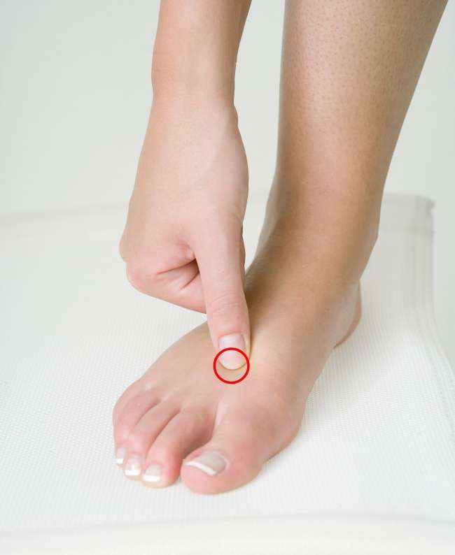 ▼湧泉:位於第二和第三腳趾之間。按摩這個穴位能夠治療頭痛、噁心、昏厥。