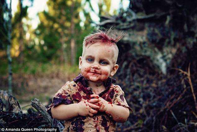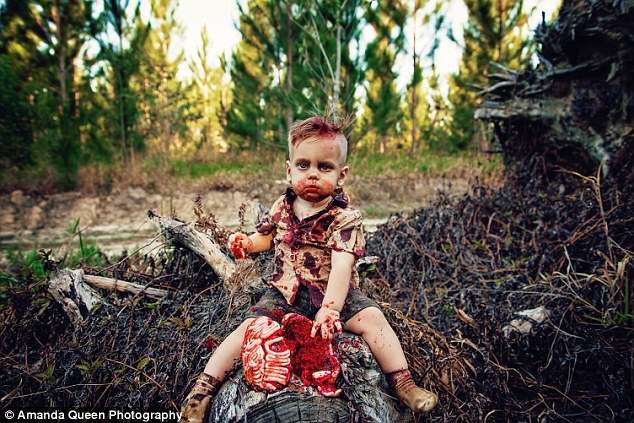 ▼艾米讓孩子拍下這組照片也是有意義的,因為菲尼克斯算是「起死回生」,就像土裡爬出的殭屍一樣,所以他們決定給他做殭屍裝扮。而人腦就象徵了那個當初被宣布死訊的他,如今菲尼克斯打破了這個死亡。