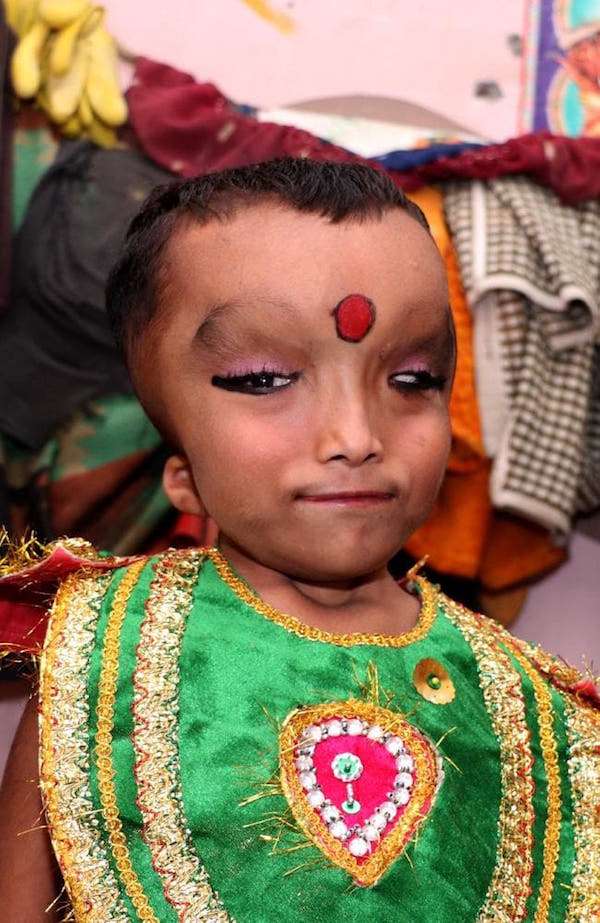 ▼普拉舒天生頭部腫大,眼窩深陷,眼睛狹長,但他並沒有受到欺負,而是因為太像象頭神,所到之處都被灑花歡迎。