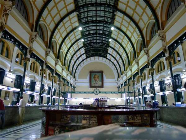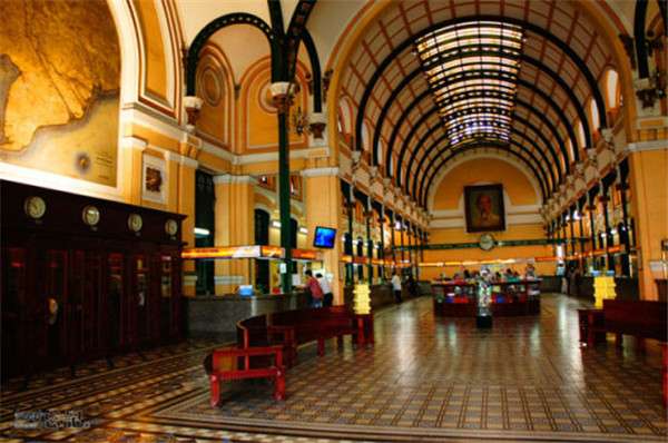 來到這裡,可以假裝自己在歐洲,因為曾是法國的殖民地,所以越南有很多建築都帶有法式風格,據說這棟郵局和艾菲爾鐵搭是同一個設計者,雖然歷史悠久,但是外觀依舊顏色鮮亮,大廳裡明亮潔淨,超大的拱形空間營造了一種歐洲老式車站的感覺。
