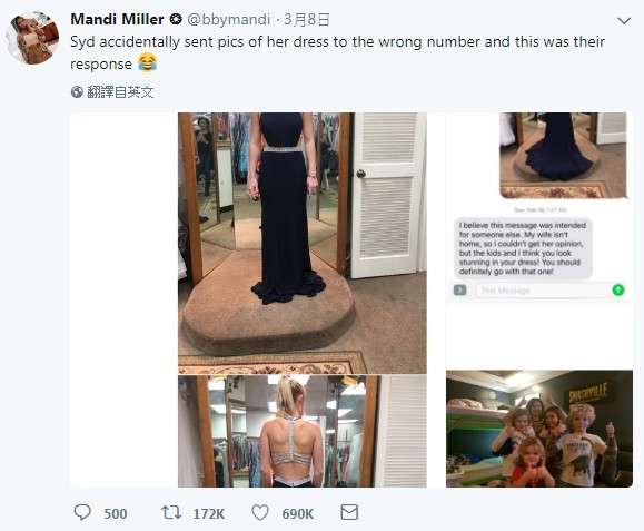 ▼可是她卻得到這樣的回覆:「我相信這則訊息應該是要傳給別人的。我老婆不在家,所以我無法詢問她意見,不過我和小孩們都覺得你穿著裙子的樣子看起來超棒!你應該買將它買下!」
