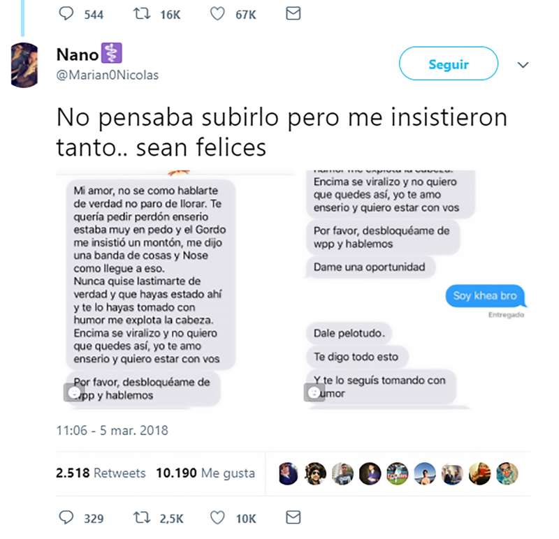 ▼馬里亞諾則在不久後表示,女友不斷跟他解釋想挽回,還放上截圖。女友對他說:「我當時喝醉了,而且那個胖子一直纏著我,他告訴了我很多事,我完全不知道為什麼會變成這樣。」、「我真的很愛你,我想繼續和你在一起。」