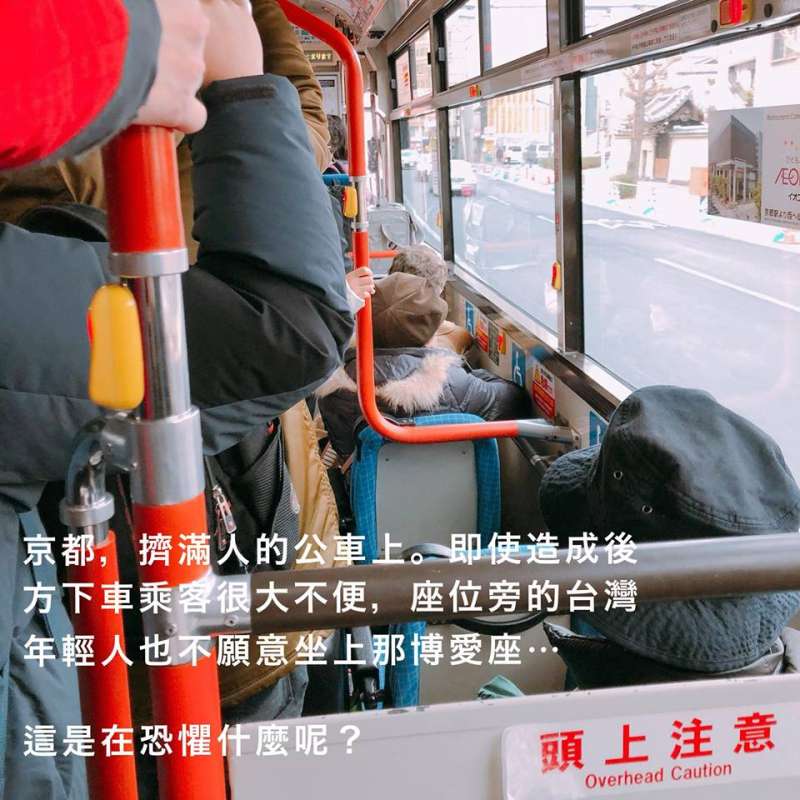 ▼先前她搭日本京都人擠人的公車時,發現自己前方的博愛座空著,但旁邊站著的年輕人即使都快撲上去了,還是沒有就座,她也秒認出,這些原來是來自台灣的可愛年輕人。
