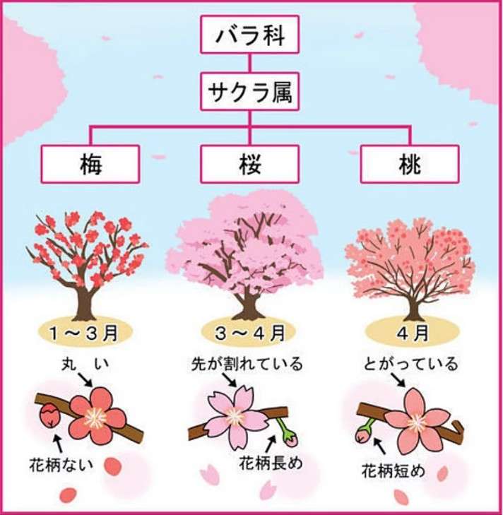 ▼可是梅花和櫻花都是一片粉紅色,到底要怎麼分辨這兩種花呢?原來兩者最大的分別是花瓣尖端的形狀,梅花是呈現圓形;而櫻花則缺了一角。在分枝方面,梅花可以單獨開花且沒有枝幹;櫻花則有很多長莖,一束束地分佈。