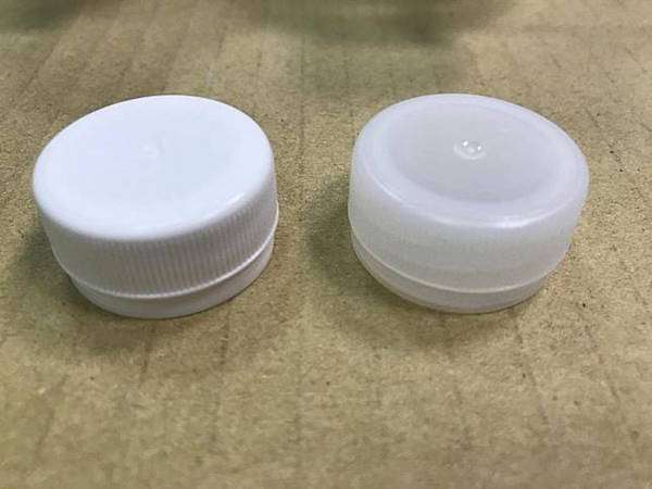 ▼丹楓之水的廠商也呼籲,正牌丹楓之水為乳白色半透明的瓶蓋(如右),李男則以白色瓶蓋冒充(如左)。另外正牌會以熱熔膠封口,冒牌則以膠帶封口,加上冒牌水的瓶身為回收,標示日期大多不正確,其實可以分辨。