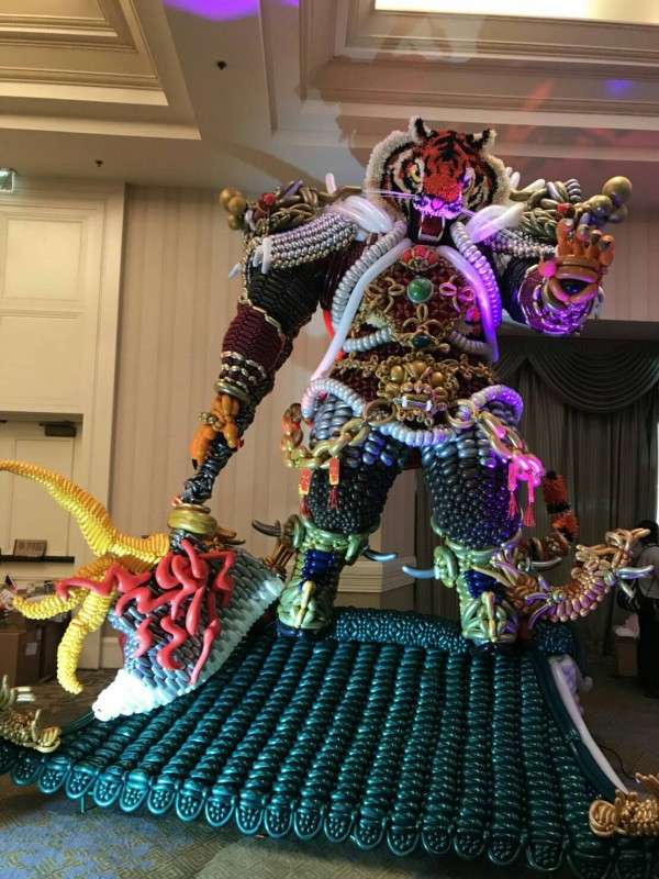 ▼世界氣球大賽比賽共有十項,包括櫥窗展示、氣球柱、造型氣球、氣球帽、外送造型、外送花束、大型雕塑作品、中型雕塑作品、嘉年華服裝和桌上型擺飾。這一次何坤龍率領中港台、新加坡、馬來西亞、泰國共28位氣球好手,使用超過5萬多條氣球合力製作出大型作品「虎將軍」,可謂栩栩如生。