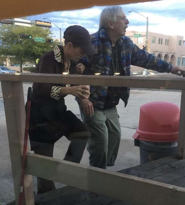 ▼一名東方女子幫忙這個心動不便的老人上樓梯、點餐,還幫他將餐單拿到他的桌子上。