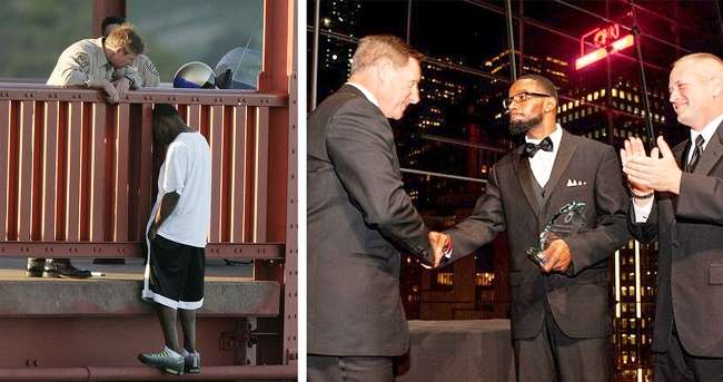 ▼多年前警察幫助了一名黑人小孩,多年後他從這名小孩手中接下嘉獎。