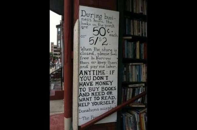 ▼這家書店在門口寫道「如果你沒有錢購買卻又想要看書,請自己拿來看。」