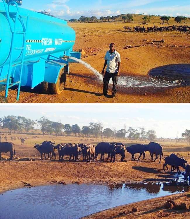 ▼為了讓野生動物有水可以喝,他每天開著送水車到沙漠中倒水。