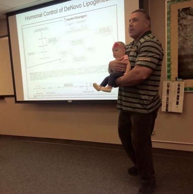 ▼大學教授因為保姆有事無法照顧他的孩子,只能帶著4個月大的女兒來教課。
