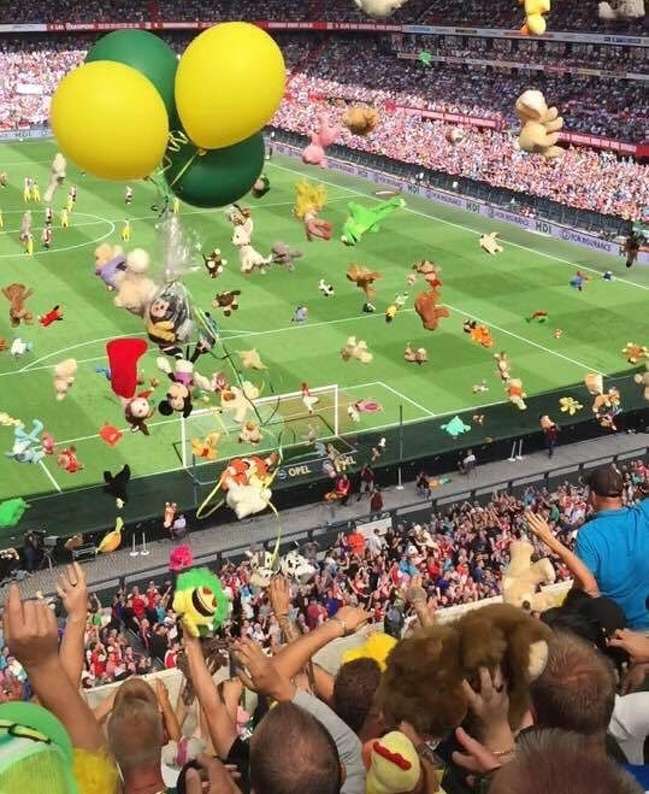 ▼加拿大球場的粉絲將玩具丟出,這些玩具將會被整理後送到各大慈善機構和醫院。