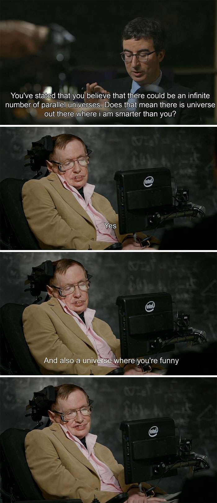 ▼在他接受John Oliver的訪問時,對方問他「你說你相信有無數個平行宇宙,是否表示有一個宇宙中我是比你聰明的?」史蒂芬霍金回答:「沒錯。」「還有一個宇宙,你會是個有趣的人。」(笑)