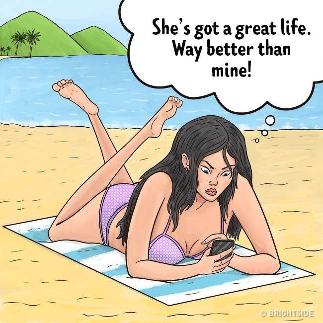 ▼嫉妒:我們很容易相信社群網站上那些美好的照片,覺得別人很幸福。事實上你不可能完全了解別人的生活。每個人都會對自己、對現狀不滿,哪怕是那些很樂觀的人也會如此。社群網站上的照片是千挑萬選後的結果,也許別人覺得你的生活很完美呢。