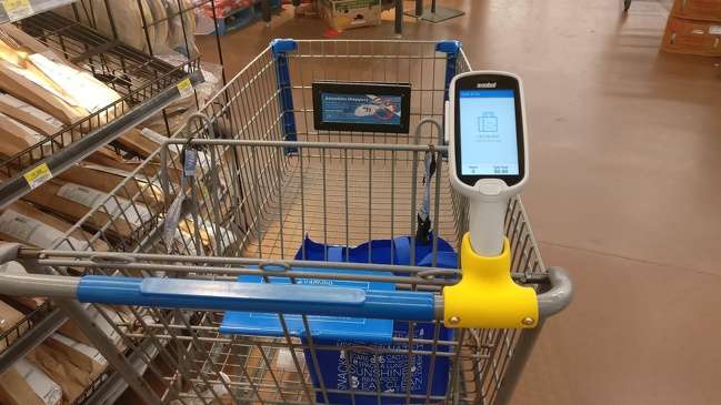 ▼超商的購物車上帶有特別的機器,能夠計算商品的價格。