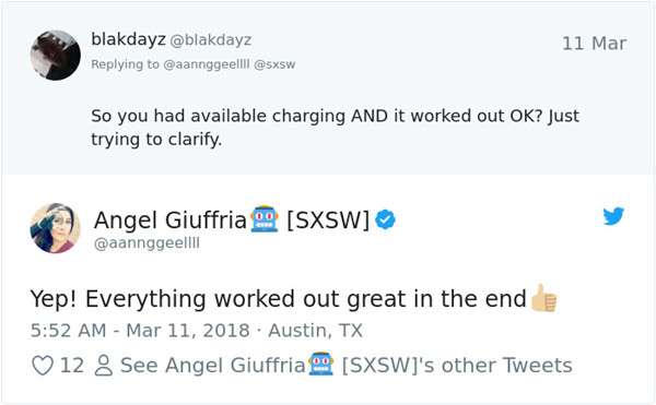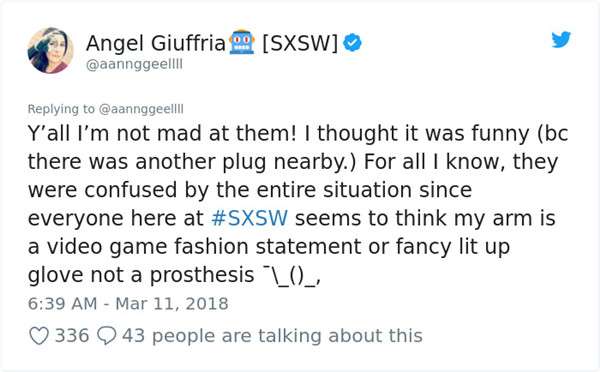 ▼最近安琪兒在推特上分享了自己的遭遇,當她在參加德州奧斯汀的SXSW(電影、交互式多媒體和音樂為主題)大會時,因為使用太久,她的機械手臂沒電了,她來到充電站,卻發現很多與會者正在給手機充電,而且拒絕讓給她地方來給手臂充電。