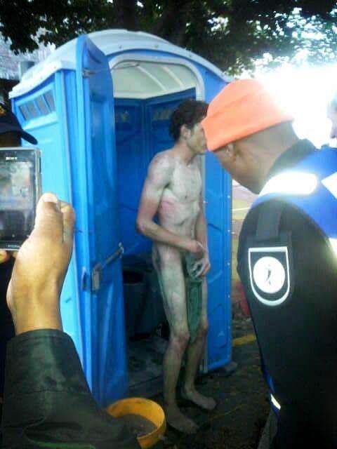 ▼圍觀的人不停拍照,那名倒楣的男子只能用T恤遮掩下體,氣氛一度十分尷尬。
