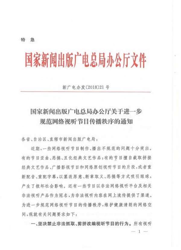 ▼中國廣電總局最近流出一份特急公文,內容提到近期某些網路影片的「不規範問題」十分突出,「擅自截取拼接經典文藝作品、廣播影視節目和網路原創視聽節目的片,或者重新配音、重配字幕、以篡改原意、斷章取義、悪搞等方式吸引眼球,產生了極壞的社會影響。」
