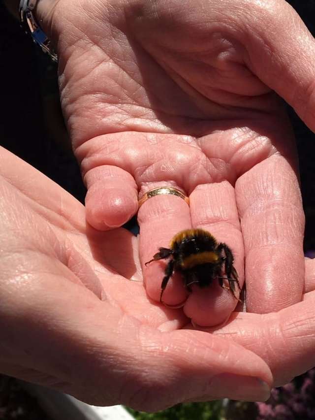 去年時,蘇格蘭印威內斯(Inverness)女子Fiona Presly整理花園時,偶然發現了一隻小蟲子。她伸出手想要看清楚,那隻小蟲子竟然迷迷糊糊爬到了她的手上。她這才看清,原來那是一隻漂亮的熊蜂。