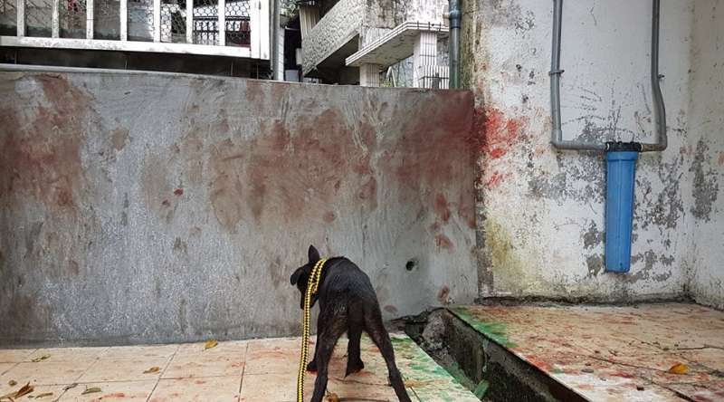 2018年03月25日本月22日,新北市動保員余重諾在出救援任務時,發現一隻黑狗狗被困在空屋的一樓圍牆內,他爬牆進去救狗狗,但卻被眼前的一幕震懾了,一面牆上佈滿了血跡,原來是狗狗數次攀爬圍牆留下的,可見牠為了逃走做了多大的努力,不僅讓人鼻酸。