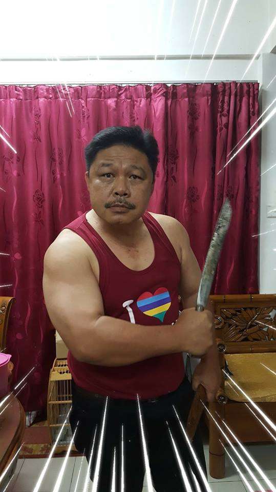 ▼警官父親在臉書上分享了自己的3組照片,一組是黑T持刀表情嚴肅,一組手持匕首穿背心露出肌肉的兇狠照,還有一張是父親兩人帶著墨鏡滿臉笑容。