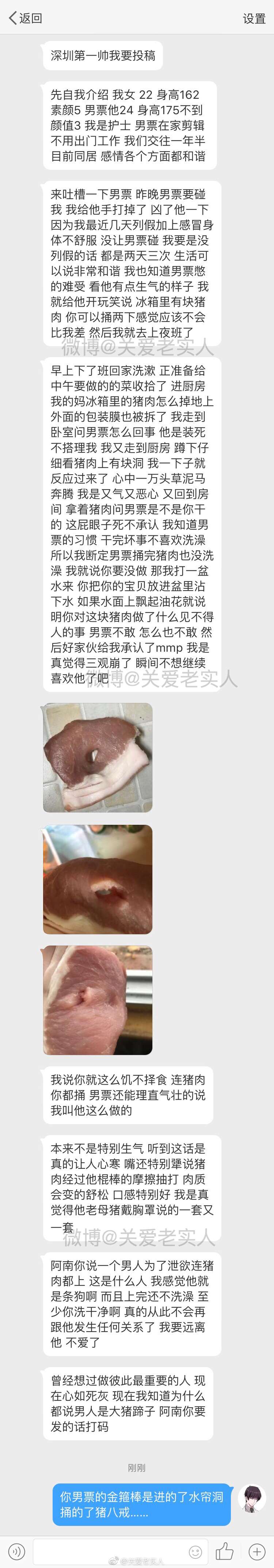 2018年03月27日中國有一名22歲的女護理師日前在知名爆料微博「關愛老實人」中匿名投稿,指出自己在某晚因為拒絕了交往一年半的男友求歡的要求,隔天竟然發現家中的豬肉「多了一個洞」!
