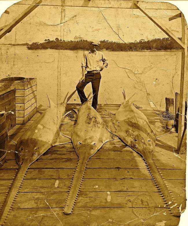 ▼10. 「1940年,我爺爺跟他剛捕捉到的鋸鰩合影。」