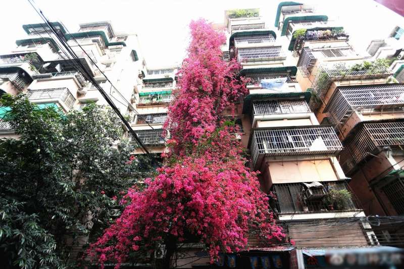 ▼後來一次偶遇大風,九重葛被吹倒。後來九重葛一直沿著牆面生長,慢慢的花也越開越多。九重葛慢慢的長大,期間也有住戶表示擋光,但羅先生仔細的修建後大家也都不再反對。