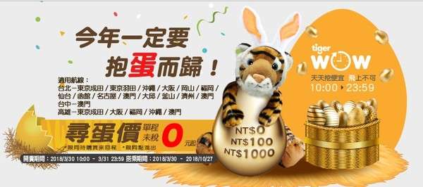 2018年03月30日今年復活節台灣虎航推出了超強大的優惠!自3月30日早上10點至3月31日23:59分為止,只要購買同點進出的指定航線來回機票,就有機會買到0元機票!