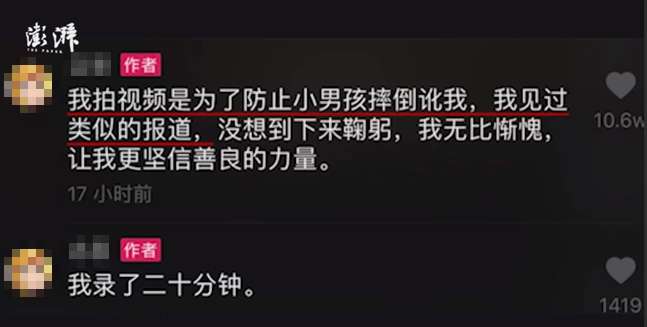 ▼那名司機很感動,又有些羞愧。他幫助男孩,又害怕對方「碰瓷」,萬一男孩不小心摔倒,自己可能被誤會,所以途中一直在錄影,想要自保。沒想到男孩竟對他鞠躬致謝,他忍不住表示:「我無比慚愧,讓我更堅信善良的力量。」