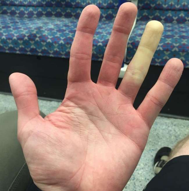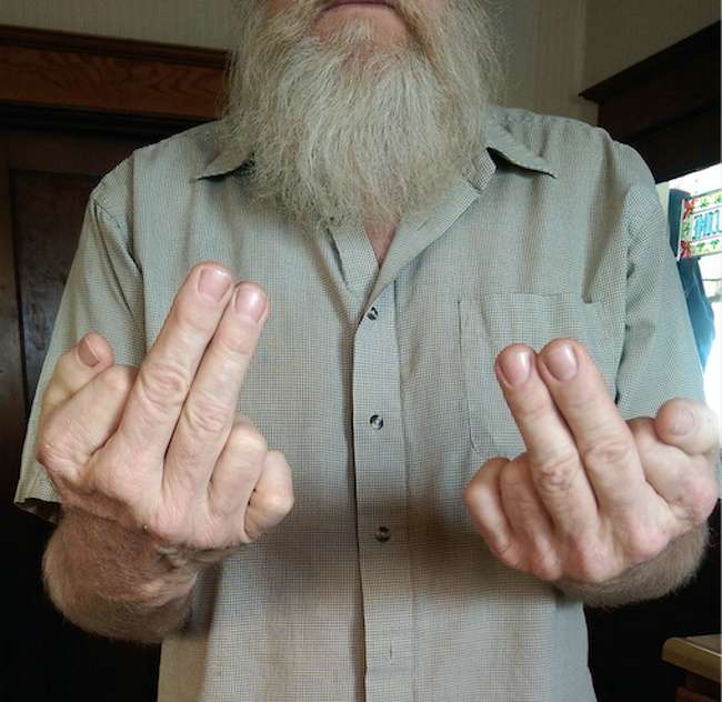 ▼兩手都擁有6指的男人,他比中指時都是用中間的那兩隻。