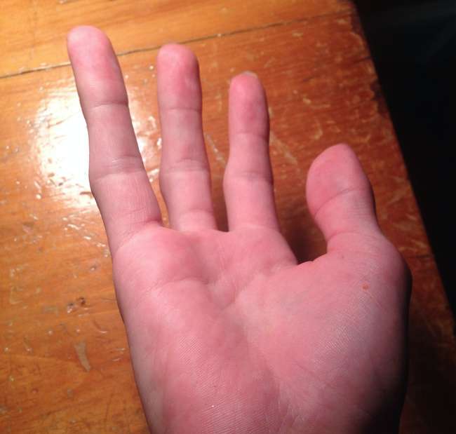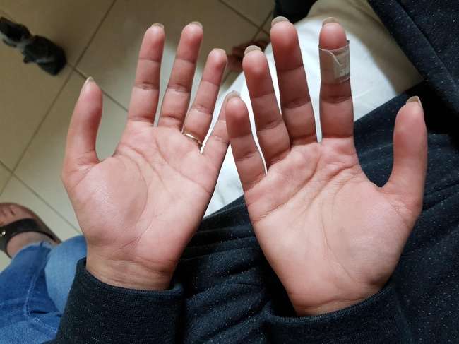 ▼她的拇指沒有指關節,兩隻手的大小也不一樣。