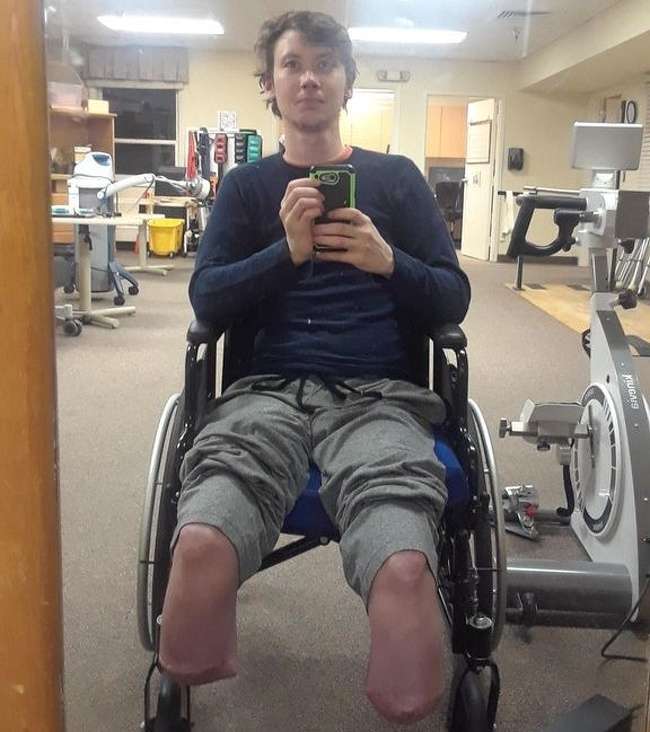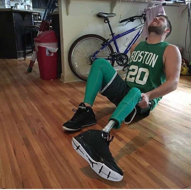 ▼雖然失去了一隻腳,可是他並沒有失去他的幽默感。